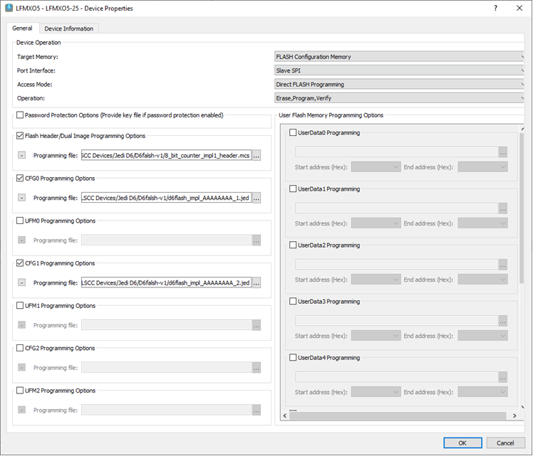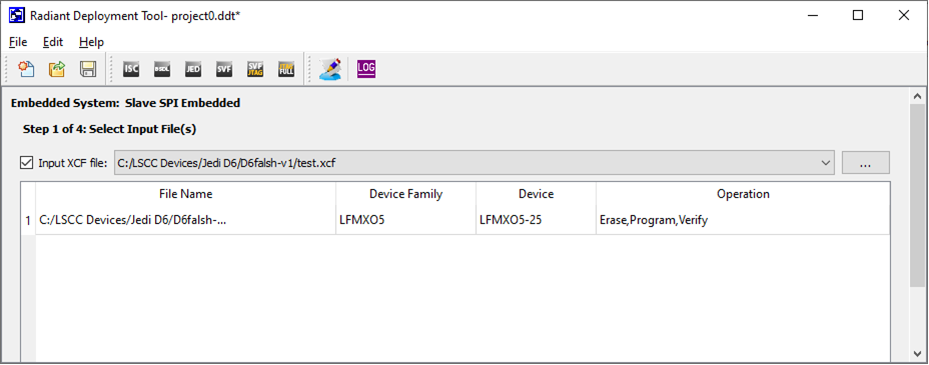 2. Next, launch Radiant Deployment Tool. Select the desired Embedded Programming method and the choose .xcf file as the input. It will include the CFG/UFM parameter save in the .xcf file.