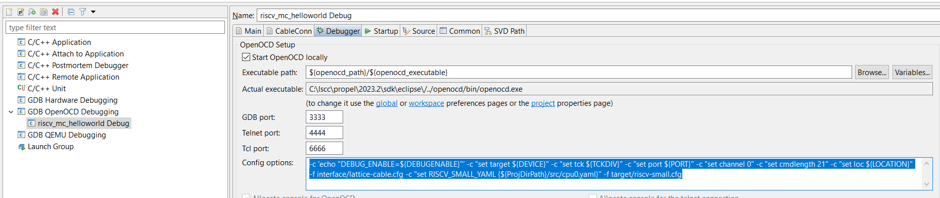 -c 'echo "DEBUG_ENABLE=${DEBUGENABLE}"' -c "set target ${DEVICE}" -c "set tck ${TCKDIV}" -c "set port ${PORT}" -c "set channel 0" -c "set cmdlength 21" -c "set loc ${LOCATION}" -f interface/lattice-cable.cfg -c "set RISCV_SMALL_YAML {${ProjDirPath}/src/cpu0.yaml}" -f target/riscv-small.cfg