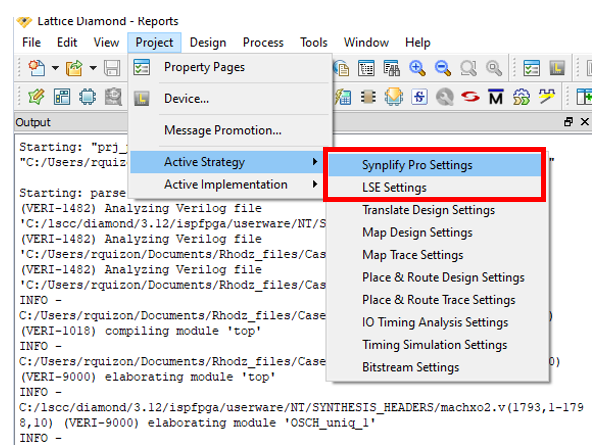 1. Project=>Active Strategy=>Synplify Pro settings/LSE Settings(depending on the synthesizer you are using):