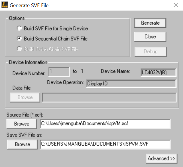 4. in the SVF file generation dialogue, select whether you want a sequential chain SVF file or SVF file for a single device and click GENERATE