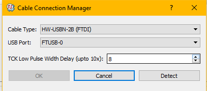 First, try to adjust the TCK Low pulse width delay to a certain value (usually between 5 and 10). This can be done in the �Design > Cable Connection Manager� settings. If above suggestion does not solve the error, verify the following items: (1) ...