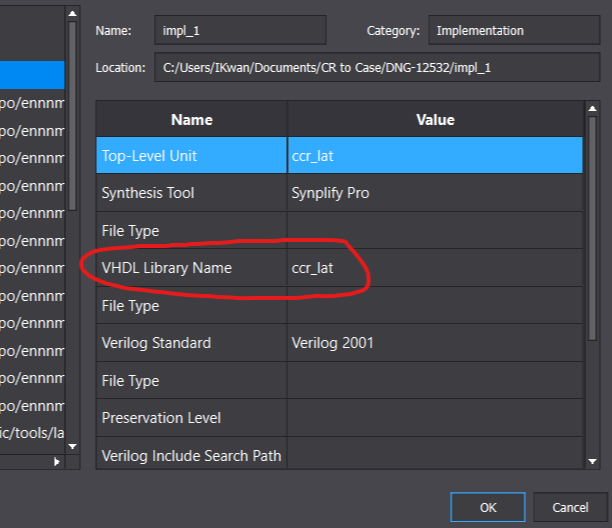 a. Change the top-level filename that is not similar to the VHDL lib (e.g. from .../ccr_lat/rtl/ccr_lat.vhd to .../ccr_lat/rtl/ccr_lat_top.vhd)