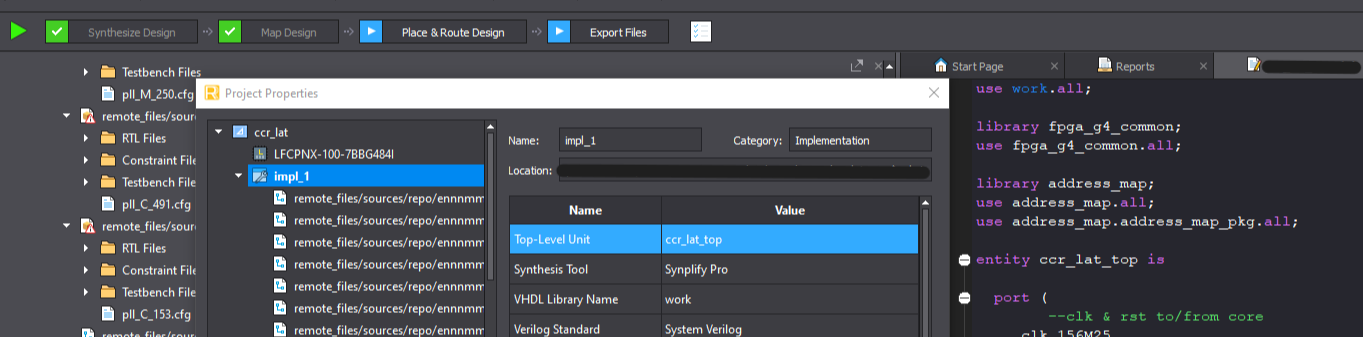 b. Update the top-level on "Project > Active Implementation > Set Top-Level Unit..."