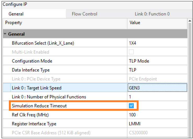 4. Parameterize the PCIE_X4, for simulation purpose, it is important to tick the Simulation Reduce Timeout option. Other parameters can be left as default (or changed). Click Generate and Finish.