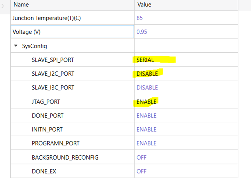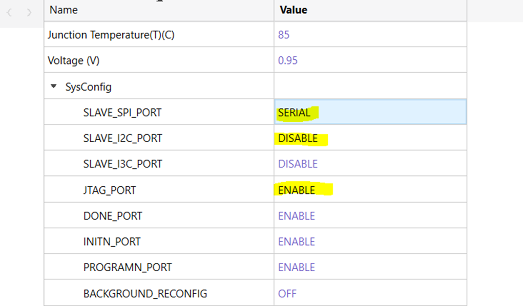 Notice from the sample settings above that SLAVE_SPI_PORT has a setting DISABLE on line 1 and SERIAL on line 3. In this case, there might be confusion on user side on which settings will be applied. In scenarios like these, IT IS THE LATER line that is followed. In this example, the device constraint editor will have a SLAVE_SPI_PORT setting of SERIAL and the DISABLE setting from line 1 will not take effect.