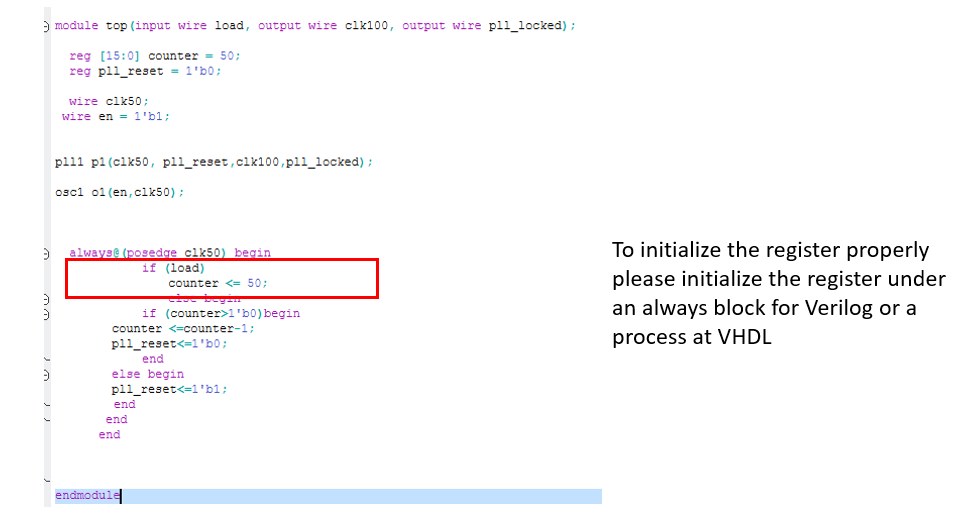 To fix this issue, initialize the value of the register under the always block, see example below: