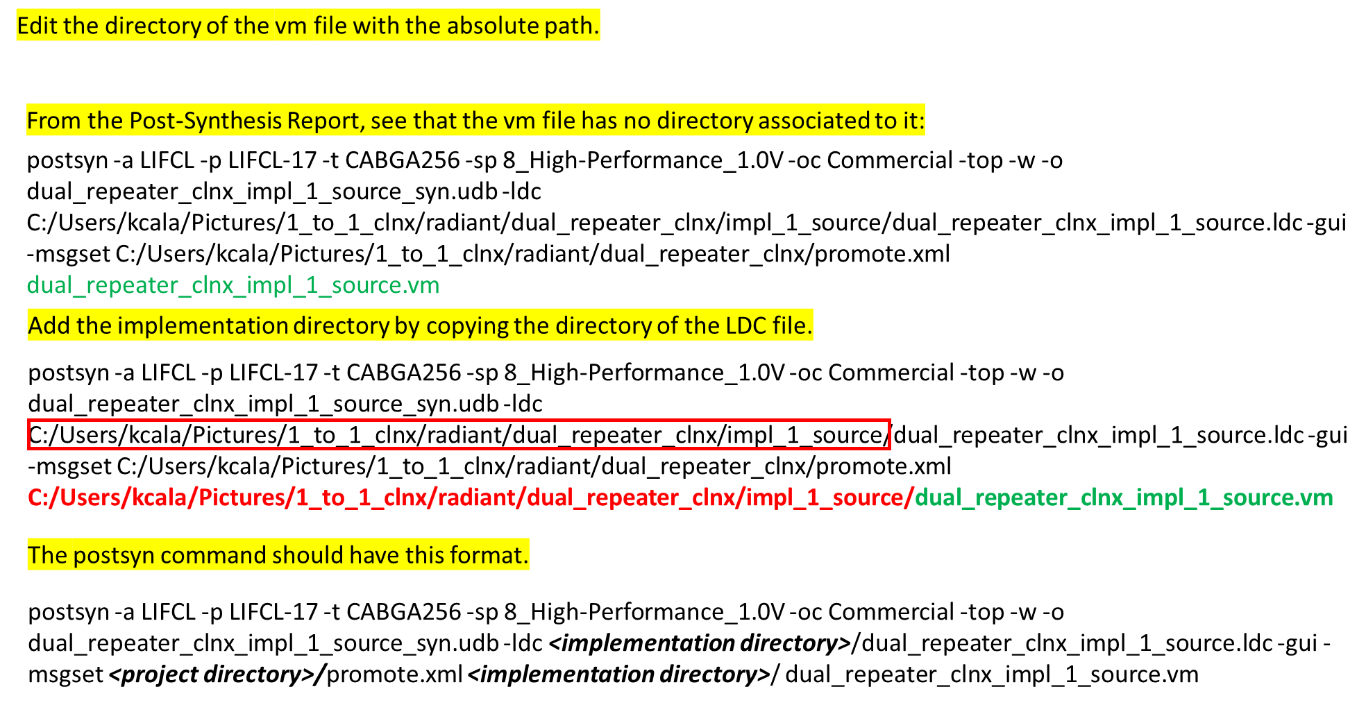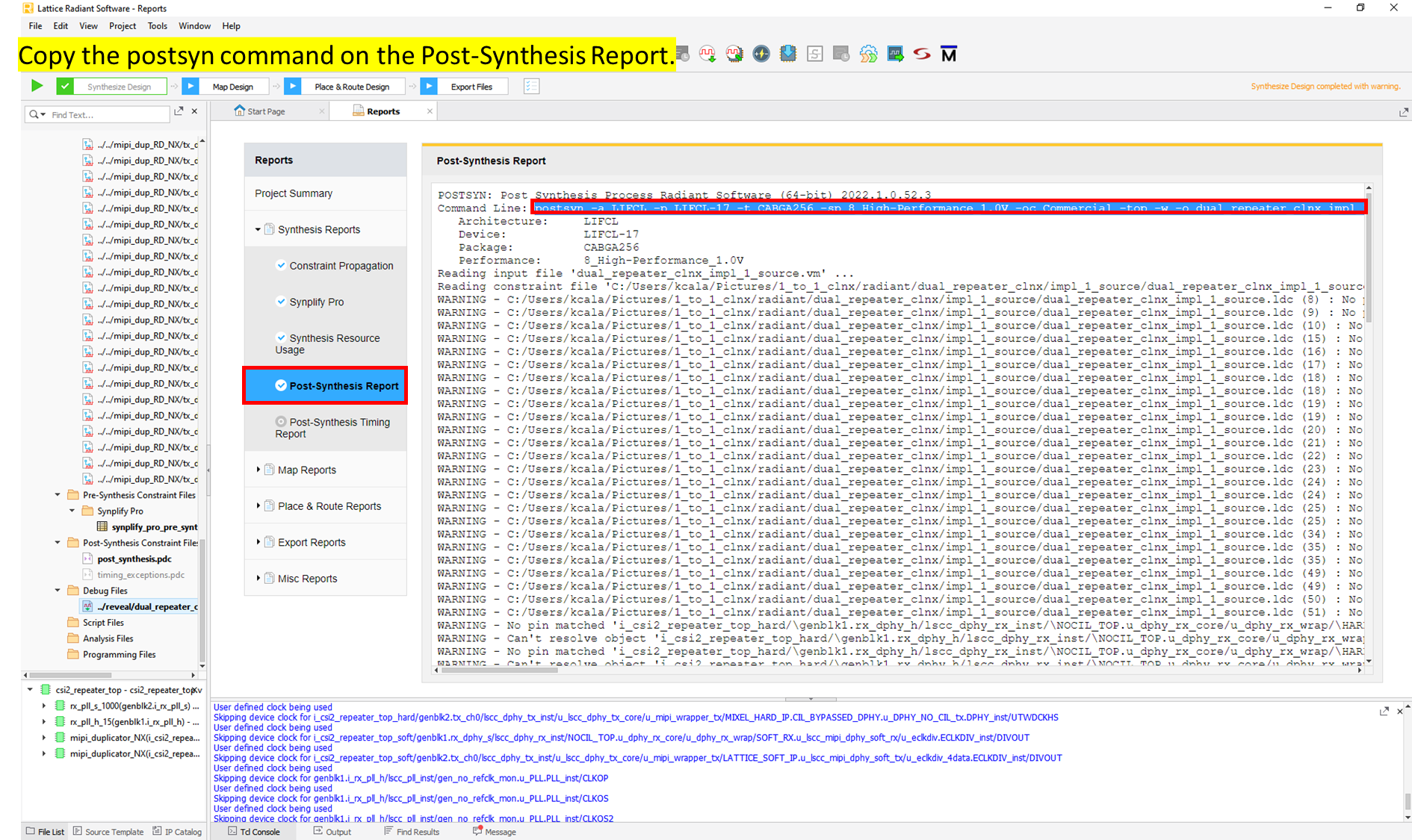 4. Enter into the Radiant Tcl console the command found at the top of the postsyn report into the tcl console (the postsyn report will have the filename <project_name>_<implementation_name>_syn.psn)Note: the path for the .vm file may need to be edited, the implementation directory would likely need to be appended to the front of the .vm file in the command, or the absolute path can be used.
