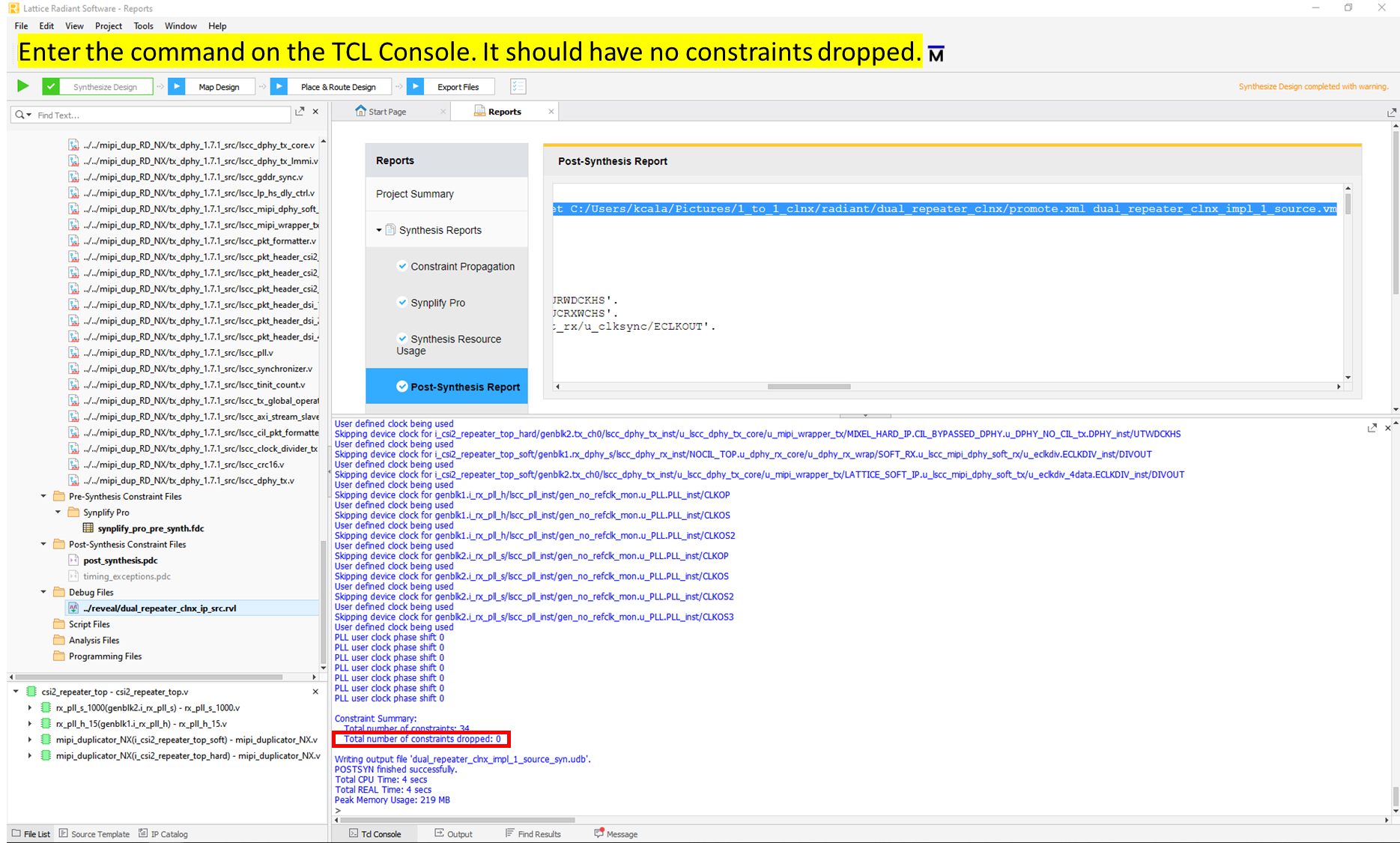 5. After running postsyn in the tcl console, it should seen that 0 constraints are dropped6. Run map and PAR flow as normal (Do not "run from start")