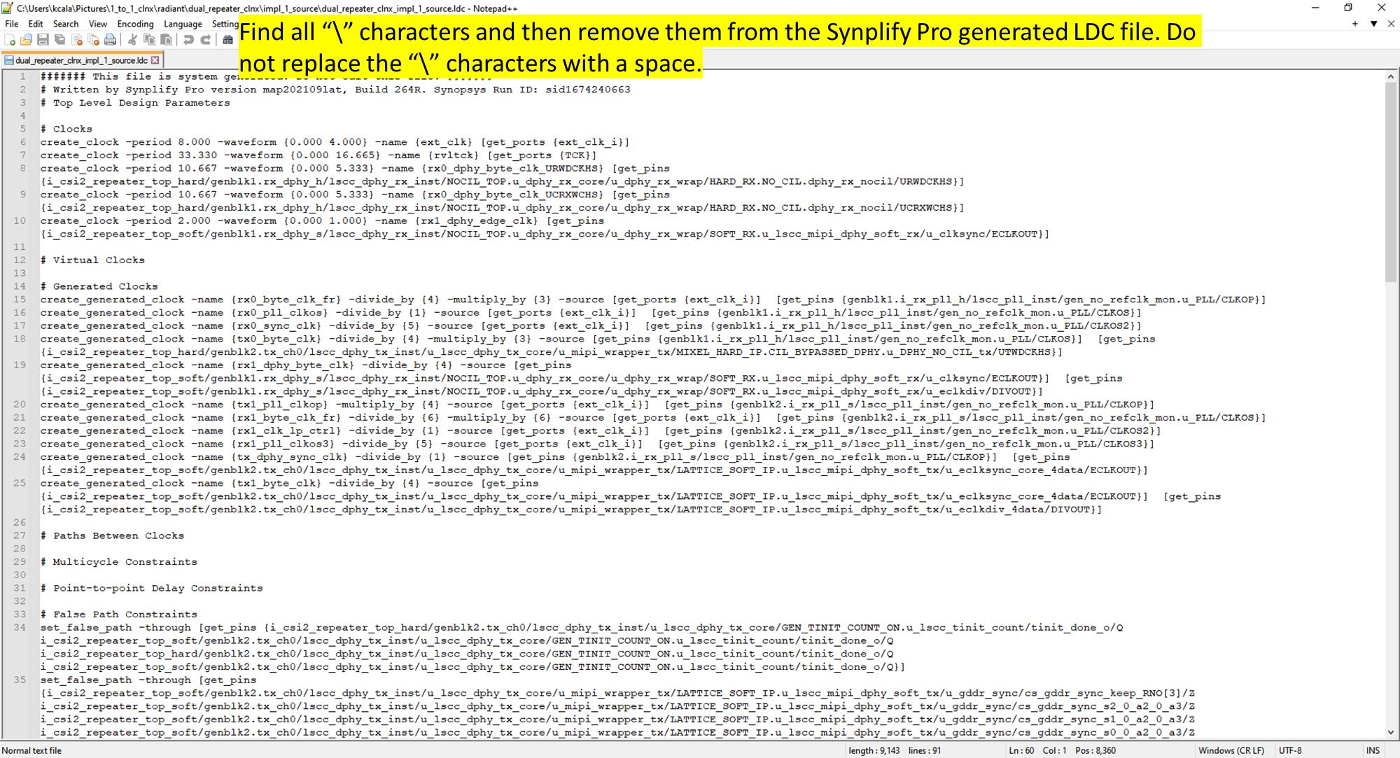Currently, there is a manual workaround so the user can resume work on the project. If the user removes the \ characters from the Synplify-generated .ldc file, then the constraints will be accepted by the database.