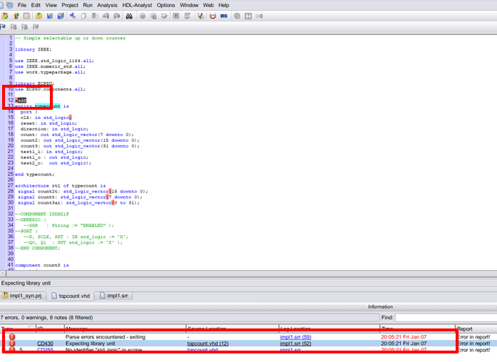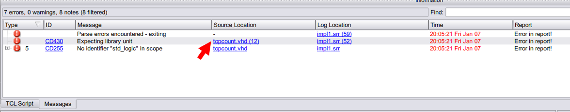 - The Synplify Pro for Lattice tool will automatically point you towards the location of the error in the source file.